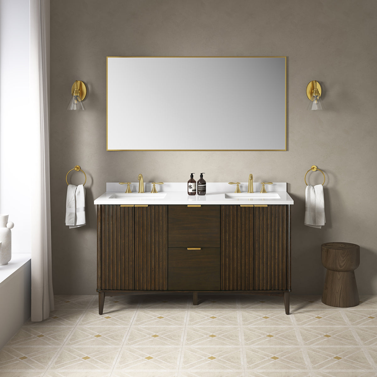 The Gabi vanity from OVE Decors is the perfect size for main bathrooms and master ensuites that are big on style. Drawing on the fluted furniture trend, it features a unique ridged design in a Dark Walnut finish that delivers a light and airy Scandinavian vibe to any space. With a sleek and smooth top, undermount sinks, and ample storage that keeps everything neatly in place, it's just the piece your home has been waiting for.