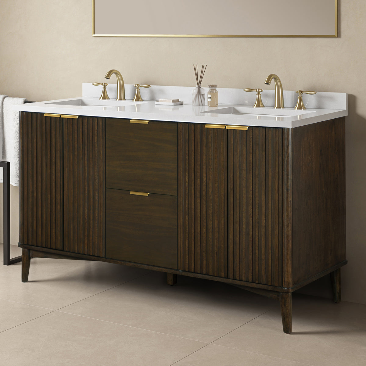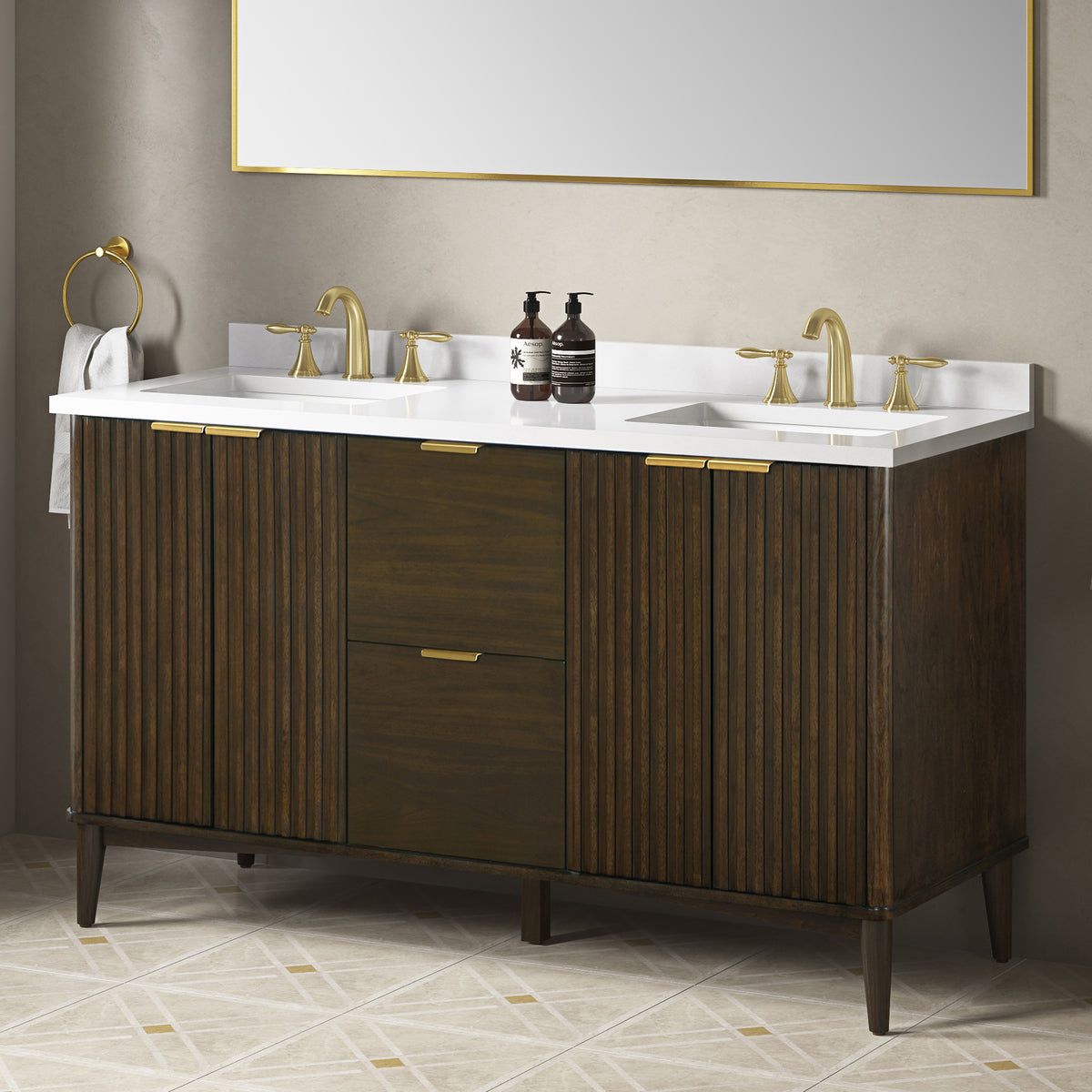 • OVE Decors Gabi 60-in Dark Walnut Undermount Double Sink Bathroom Vanity with White premium quality countertop for a Scandinavian look