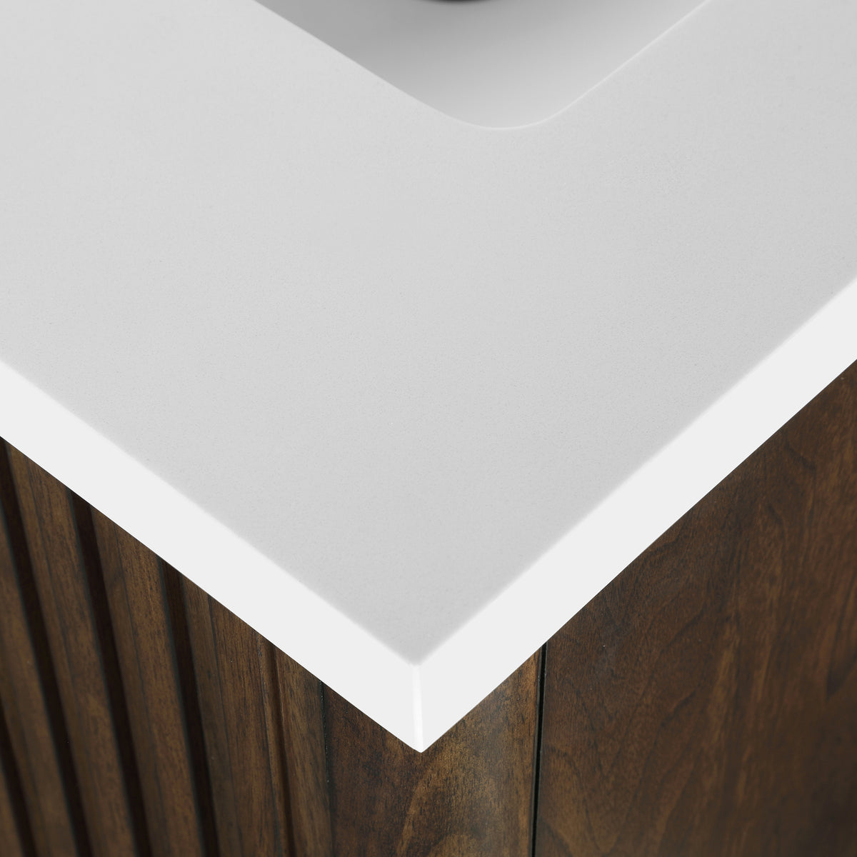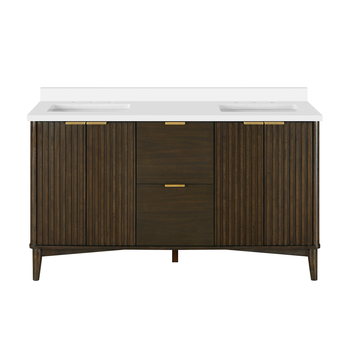 • Dark Walnut finish vanity with brushed gold hardware included. White premium quality countertop with straight edge and removable backsplash