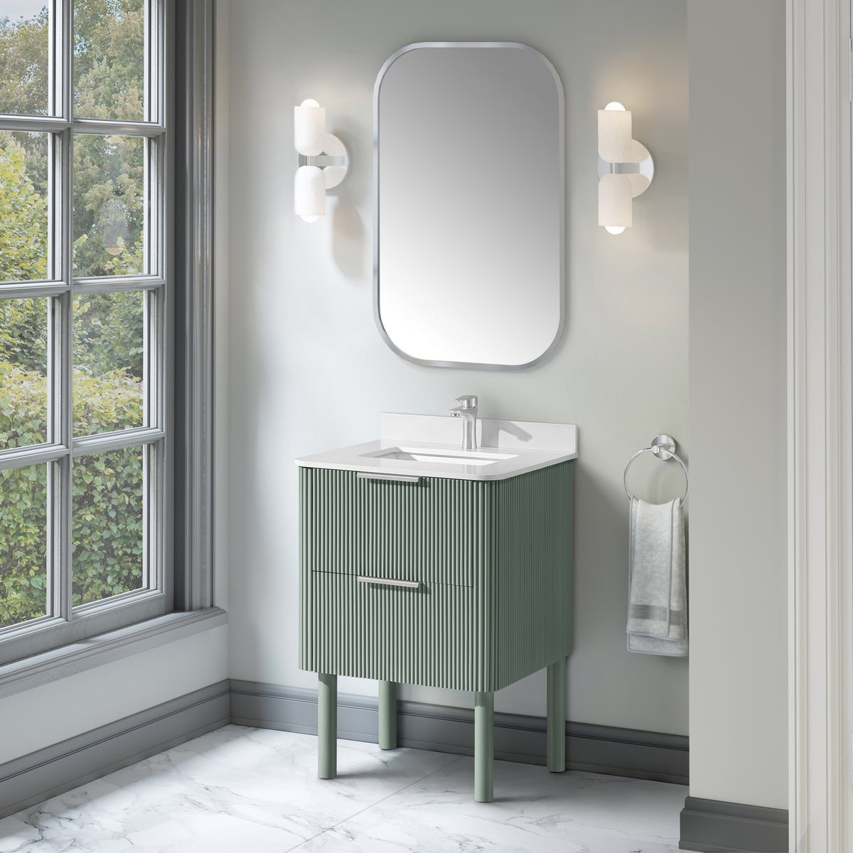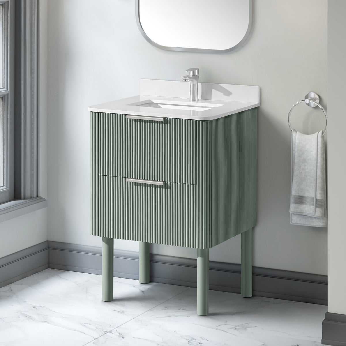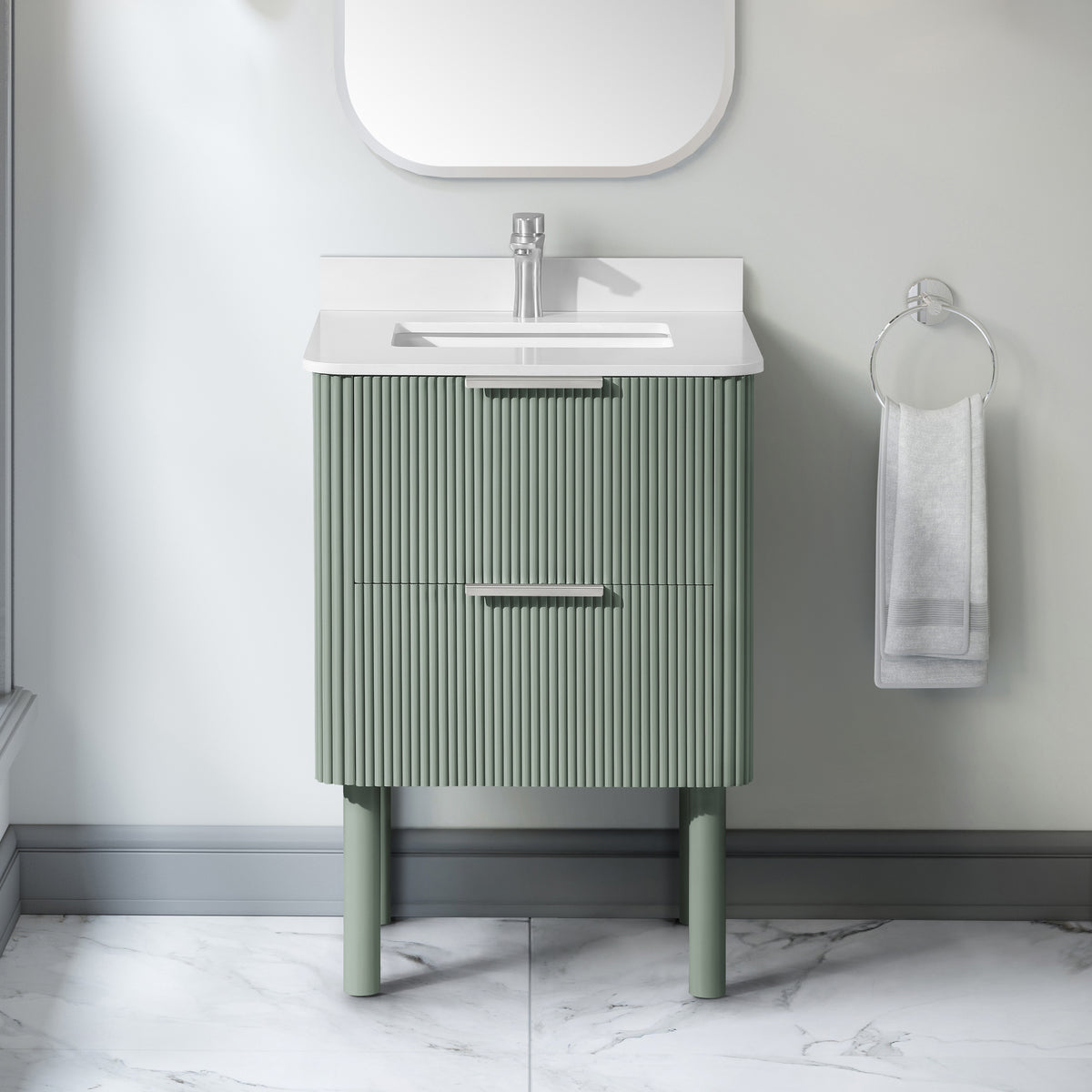 Add a fresh and refined look to your bathroom with the 24-inch Becca vanity from OVE. This fluted-design vanity features a soft Sage Green painted finish, a premium quartz countertop with rounded corners, and brushed gold hardware. Its compact footprint includes tilt-down and U-shaped soft-close drawers and offers the flexibility of either freestanding or wall-mounted installation with included legs.