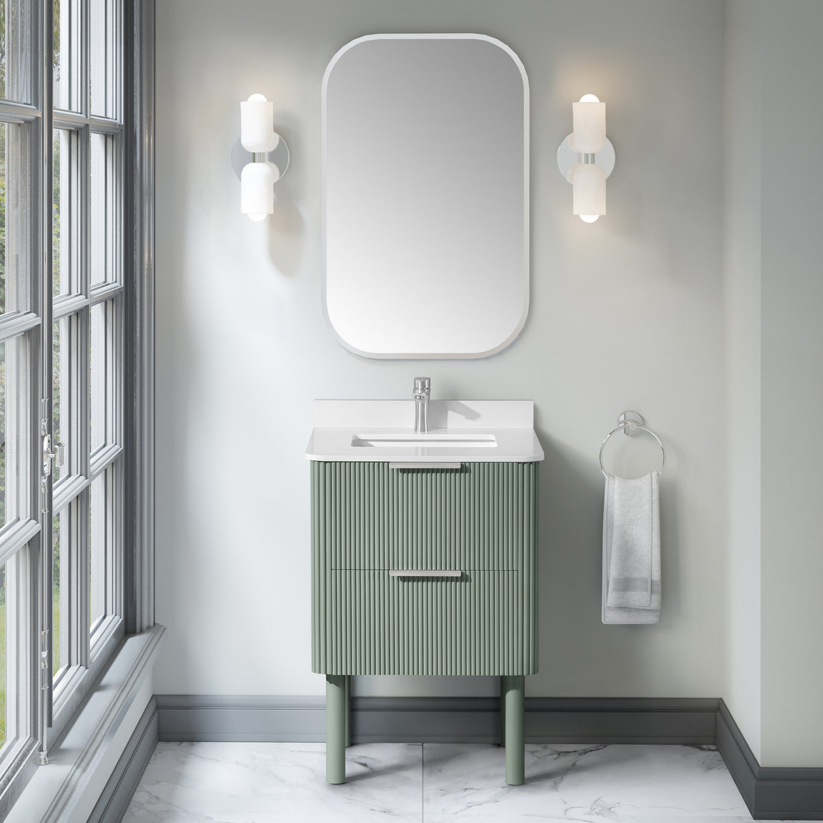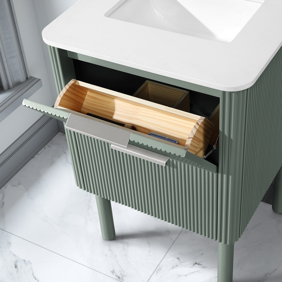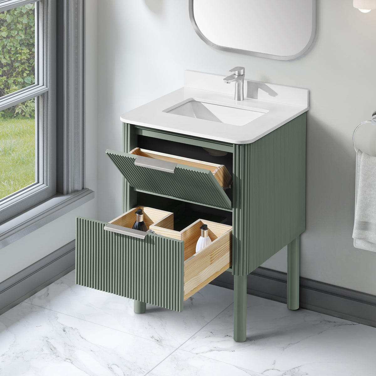 Add a fresh and refined look to your bathroom with the 24-inch Becca vanity from OVE. This fluted-design vanity features a soft Sage Green painted finish, a premium quartz countertop with rounded corners, and brushed gold hardware. Its compact footprint includes tilt-down and U-shaped soft-close drawers and offers the flexibility of either freestanding or wall-mounted installation with included legs.