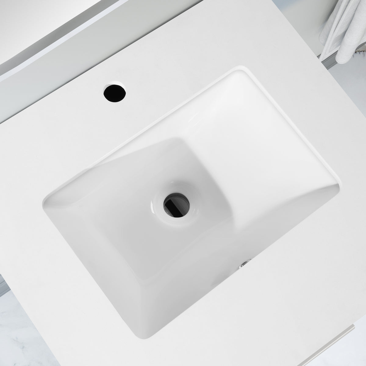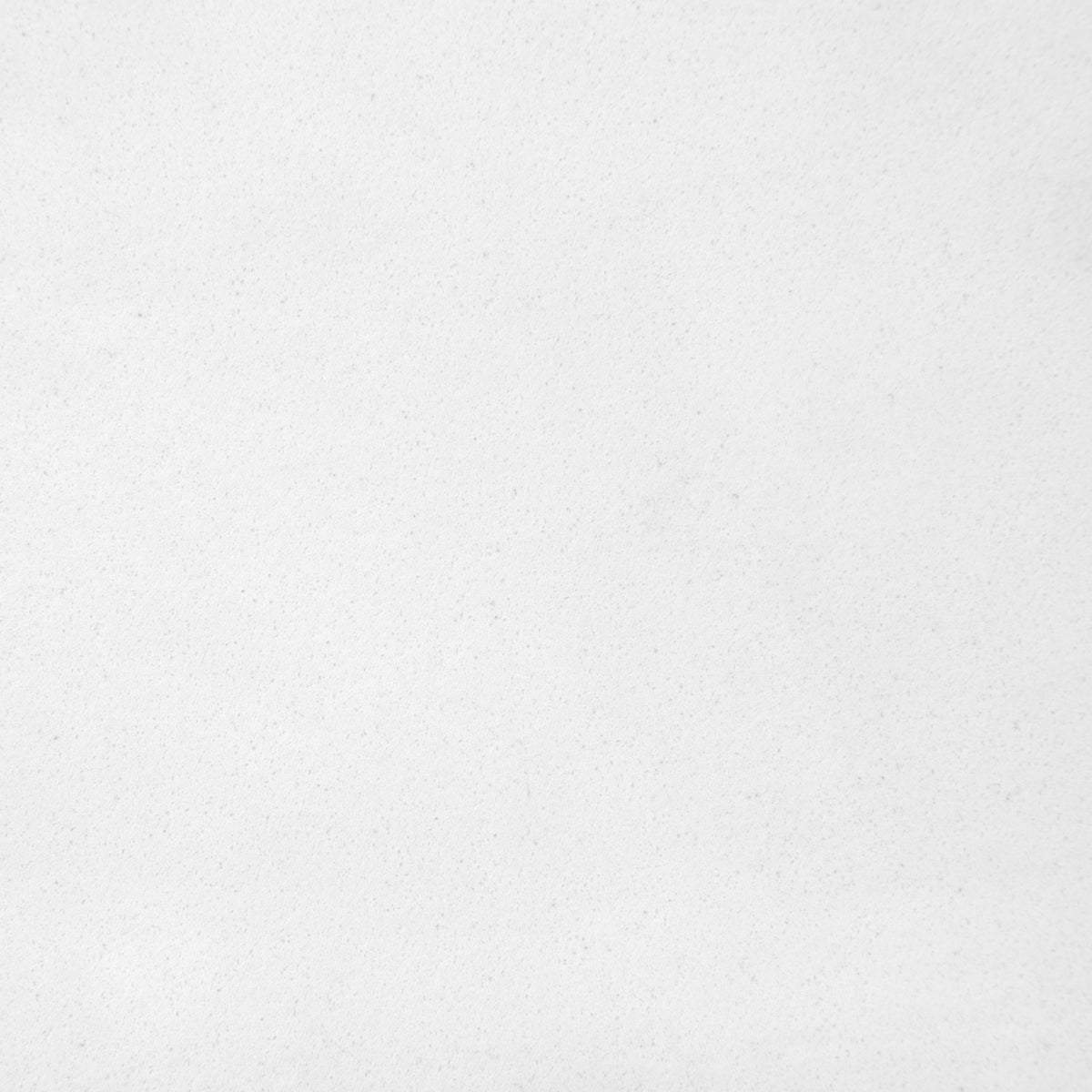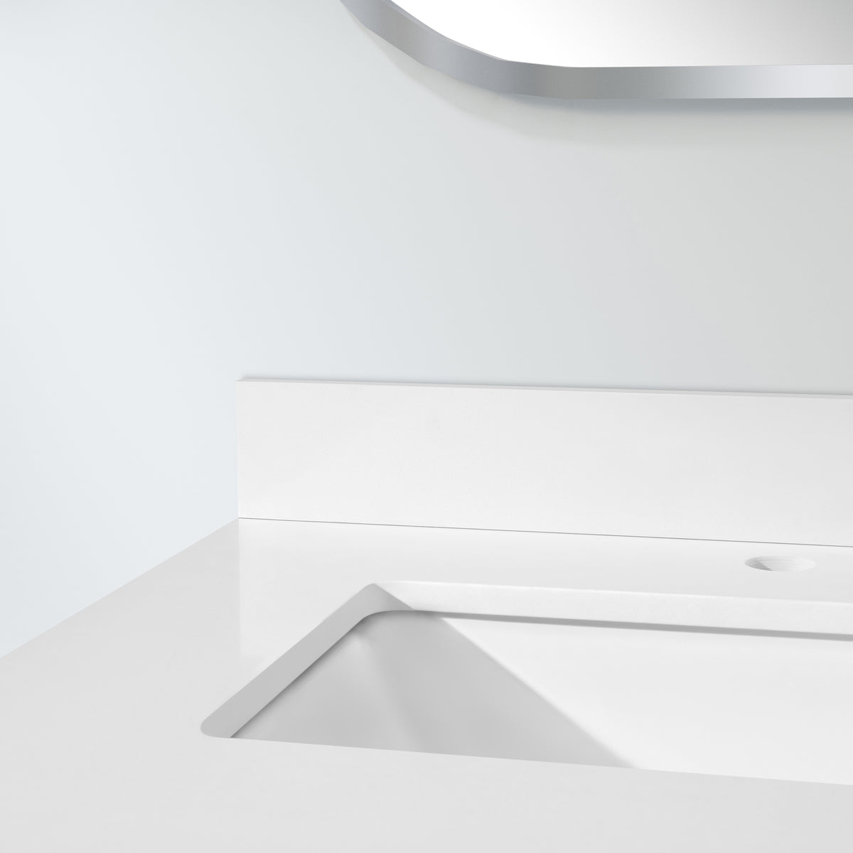 - Rounded-corner white quartz countertop with a matching 3 in. backsplash and undermount ceramic sink.