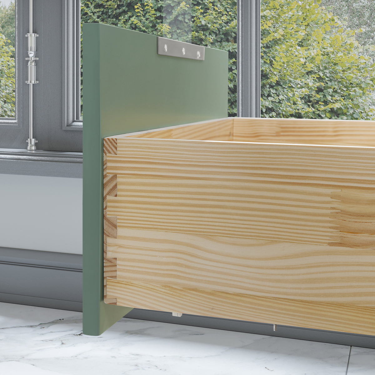 - Brushed gold hardware enhances the rich Sage Green tone with a refined finish.