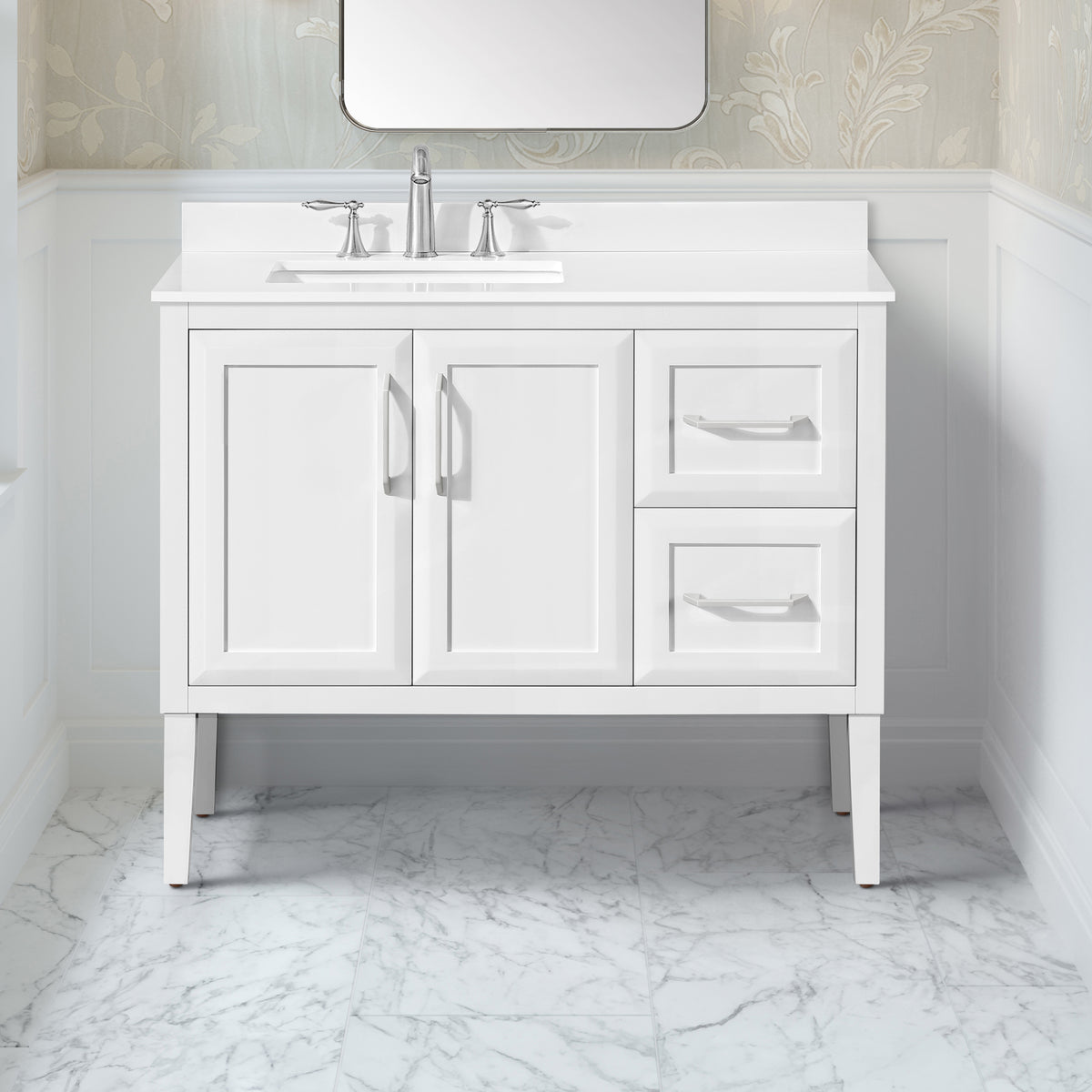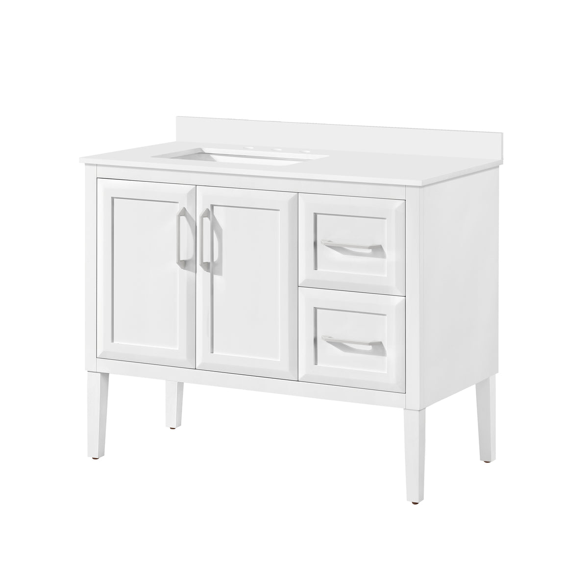 Smart and stylish, the 42-inch Lion vanity in Pure White by OVE delivers timeless design in a compact format. Its premium quartz countertop and tapered legs add subtle elegance, while soft-close drawers and dovetail pinewood construction ensure dependable daily performance. It has a gorgeously versatile design, complemented by modern engineering that accommodates for either freestanding or wall-mounted installation, whatever suits your bathroom best.
