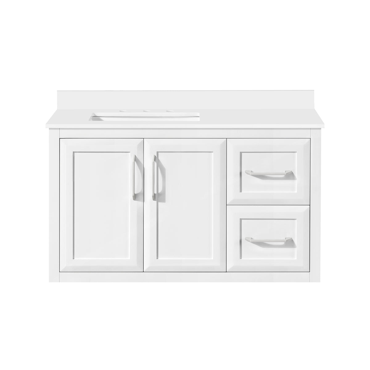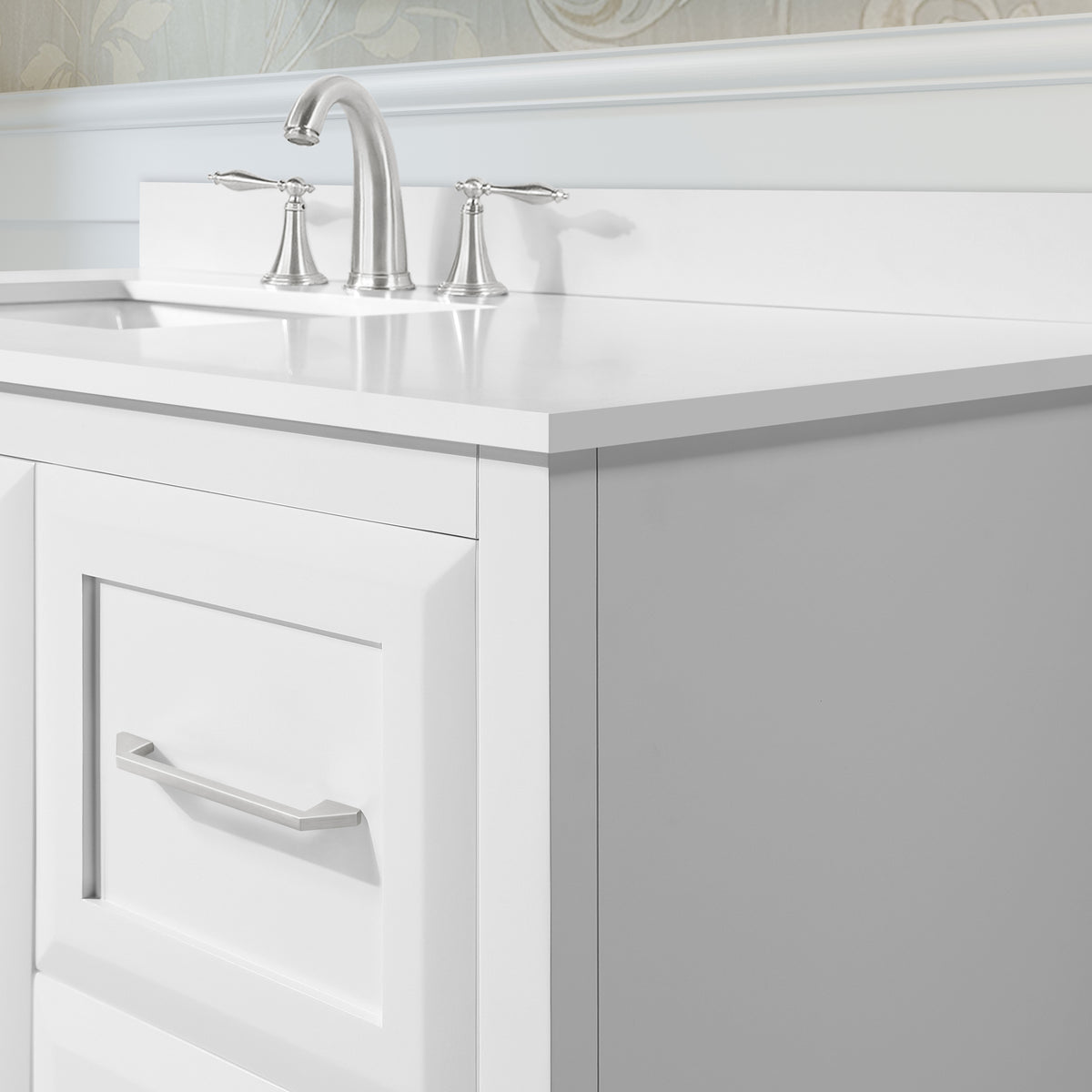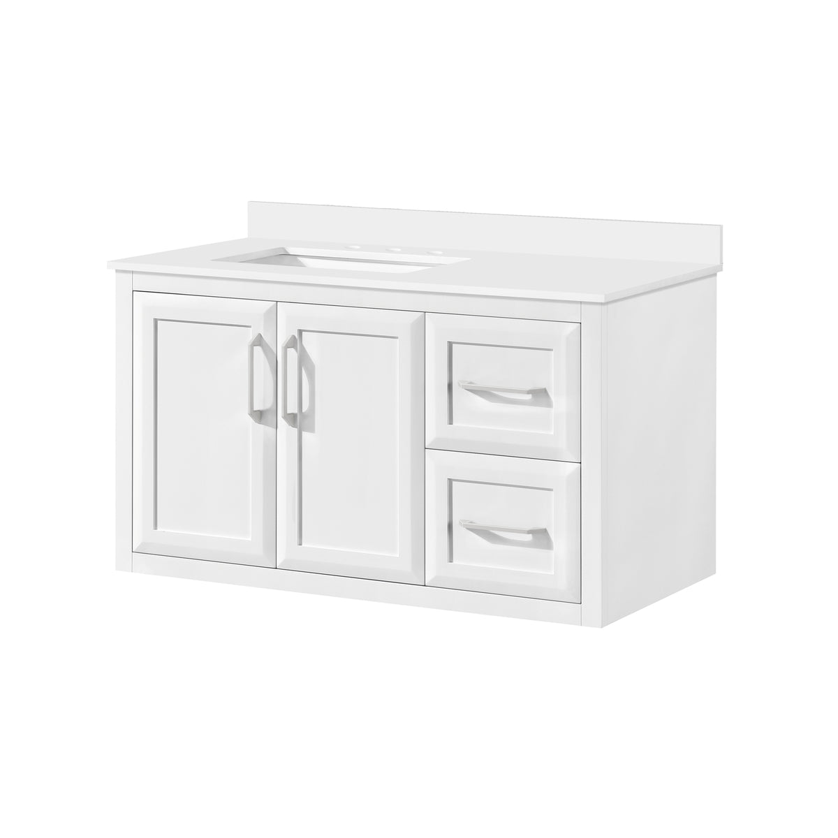 • Durable and easy to maintain, the white quartz top includes an undermount ceramic sink.