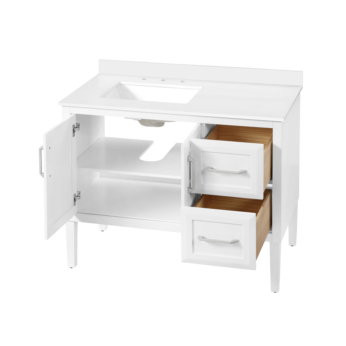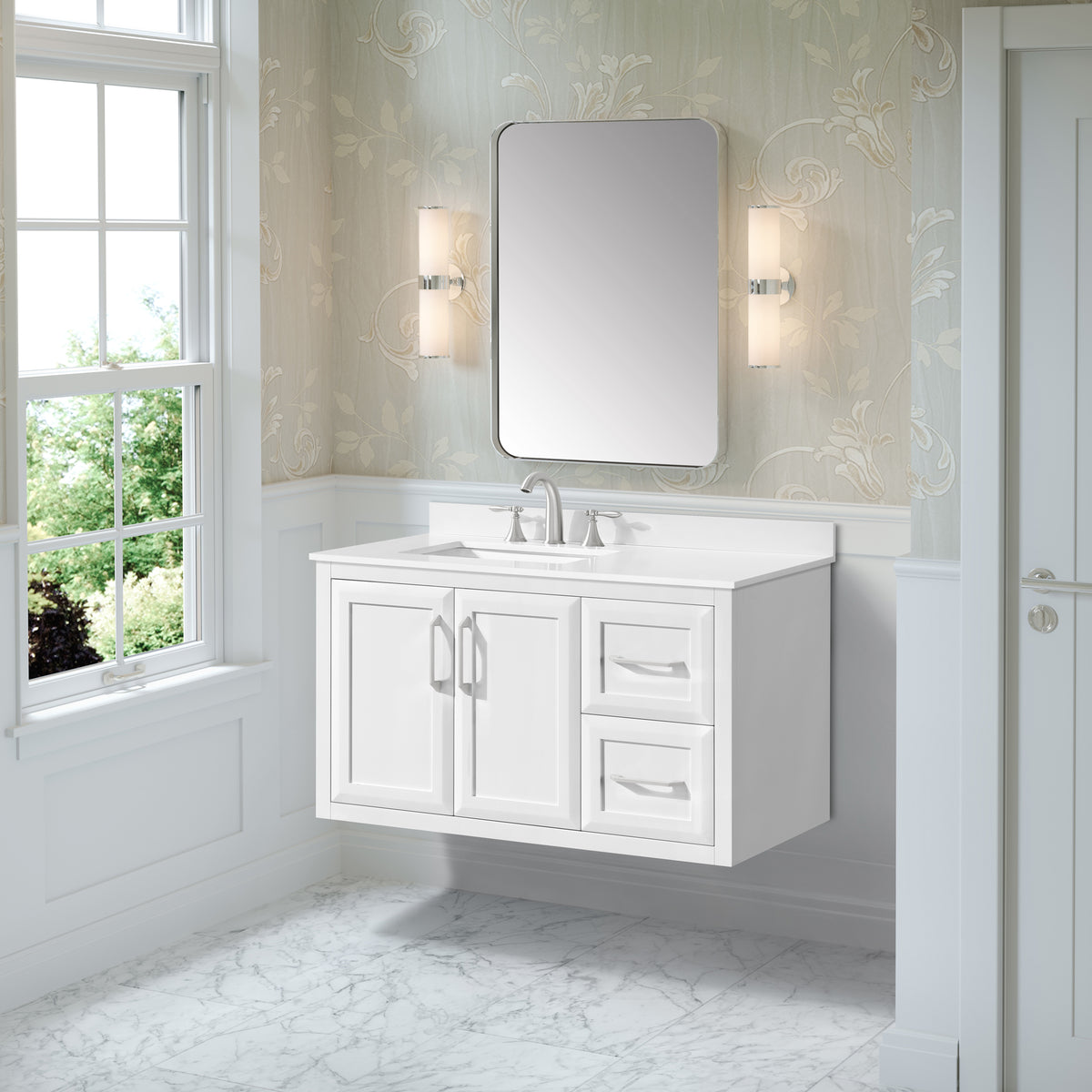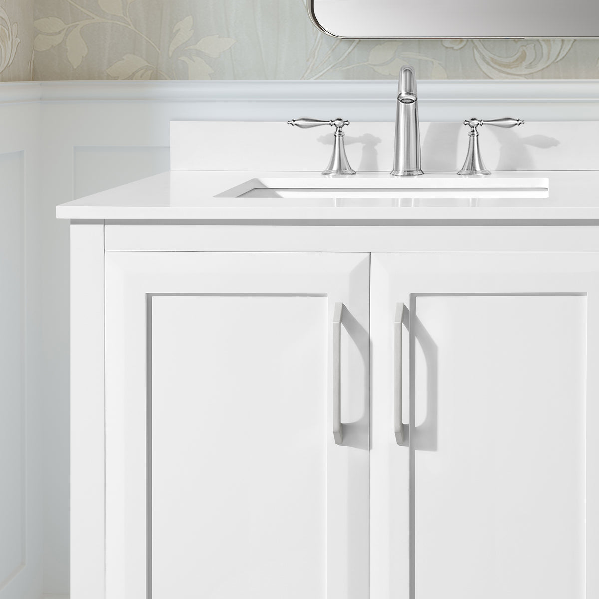 • Durable and easy to maintain, the white quartz top includes an undermount ceramic sink.