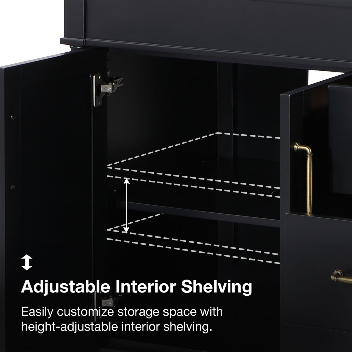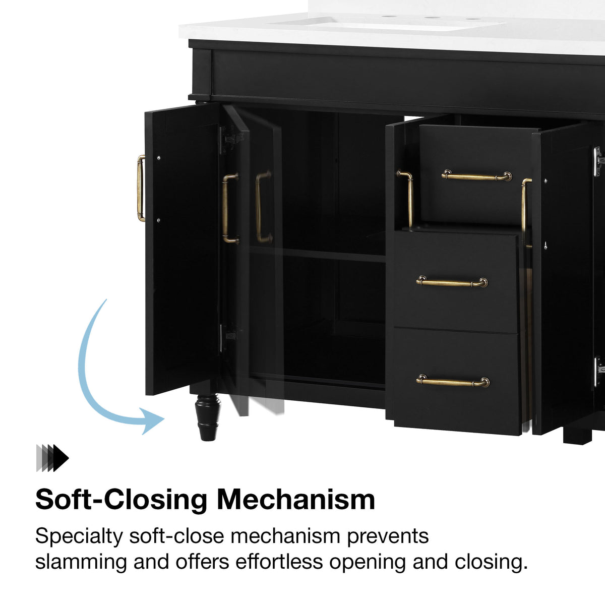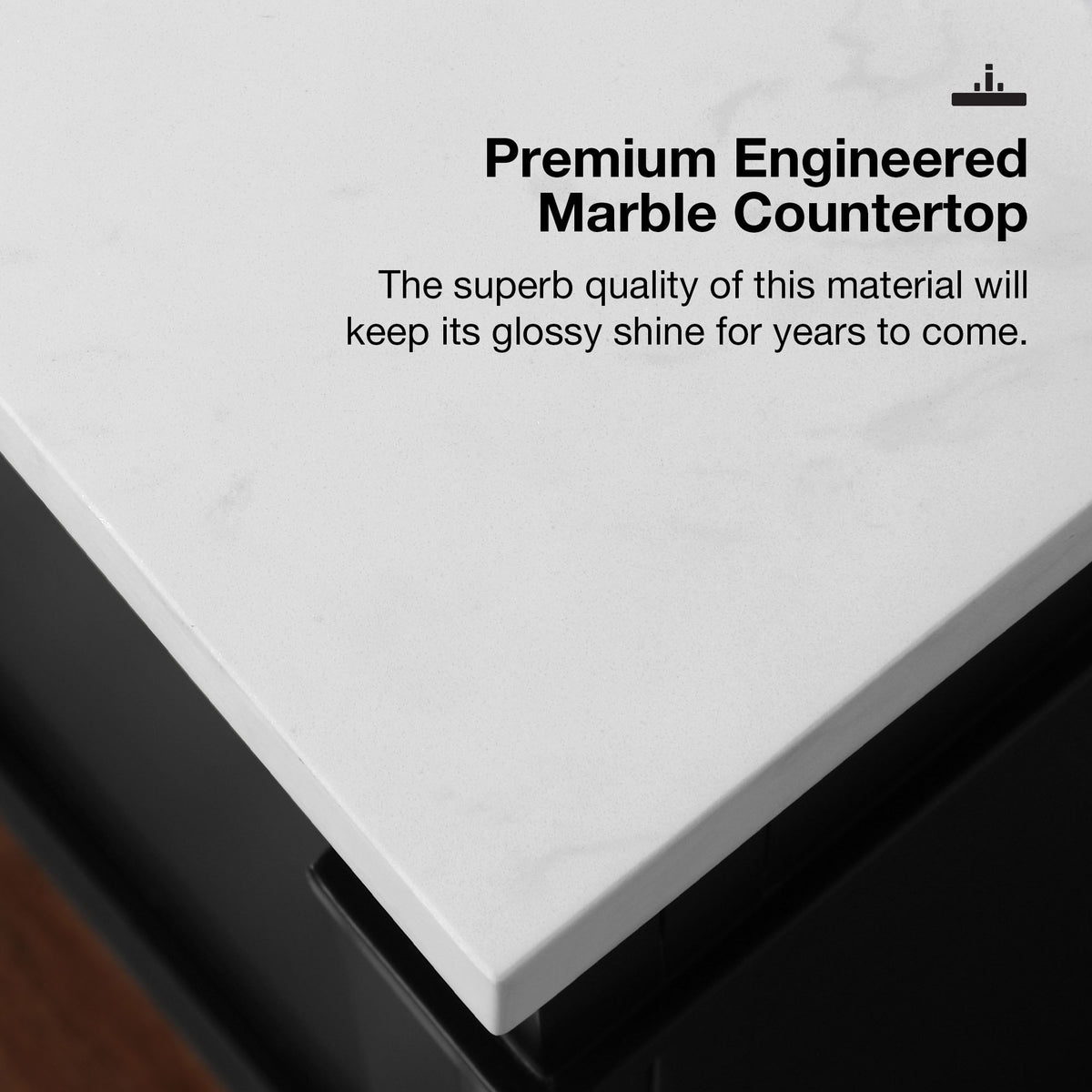 • Pure White or Impress Black finishes with brass hardware included. White engineered marble countertop with straight edge and removable backsplash